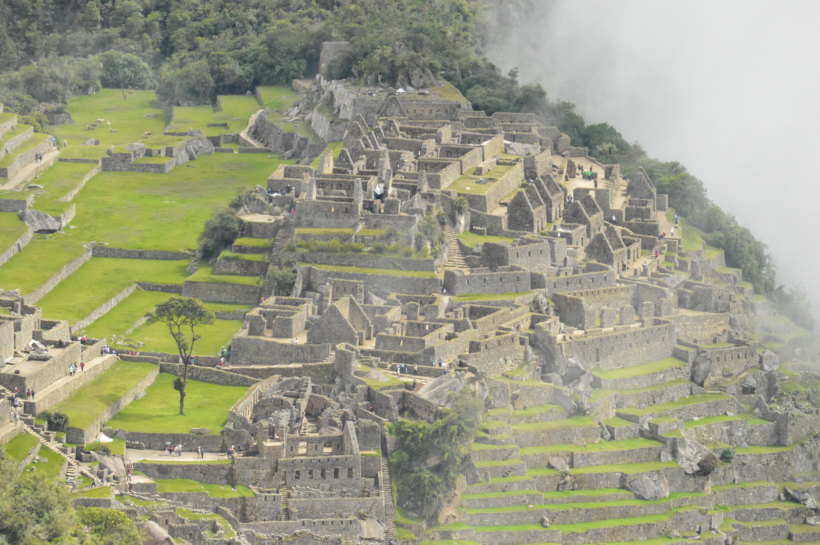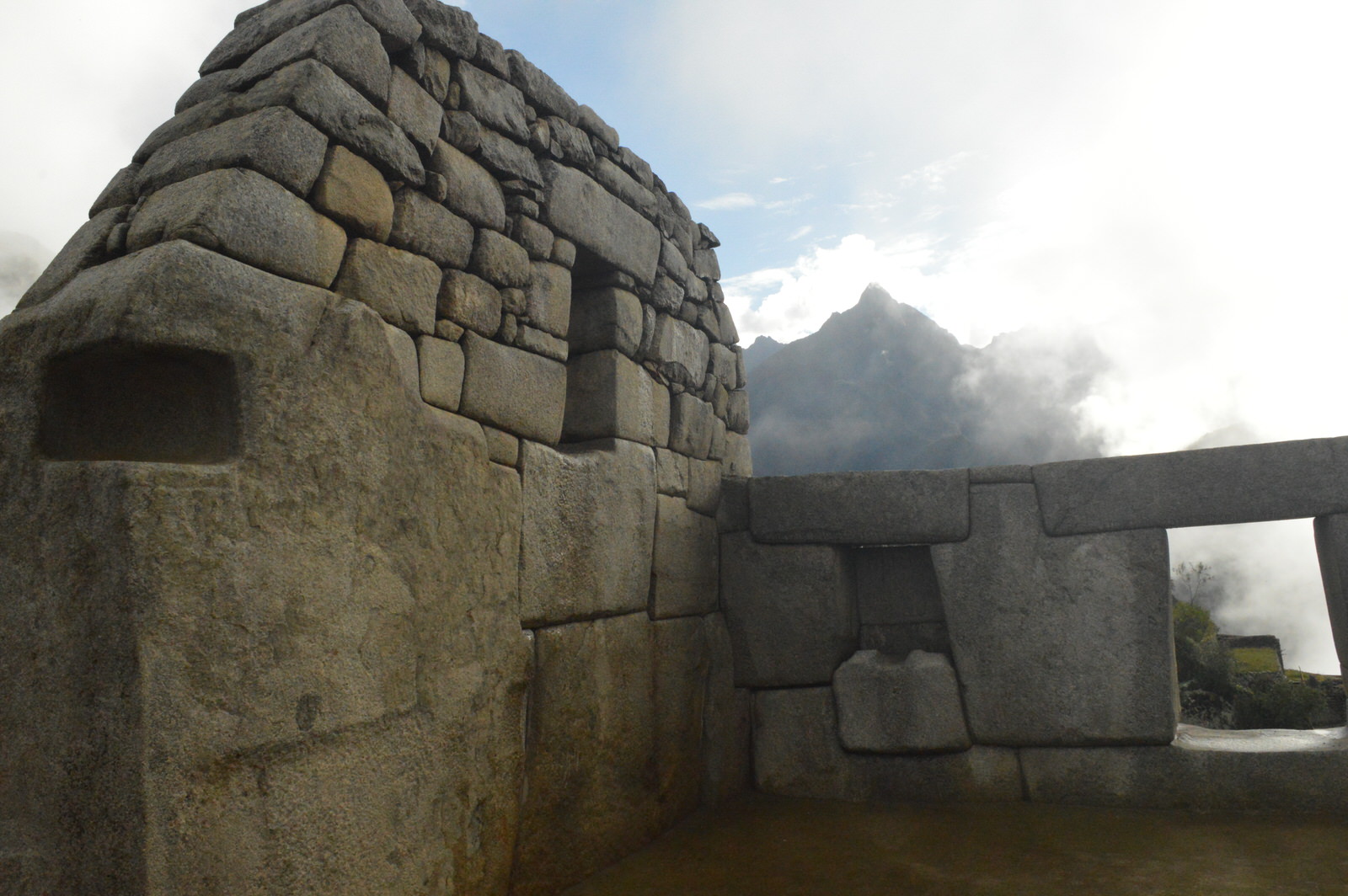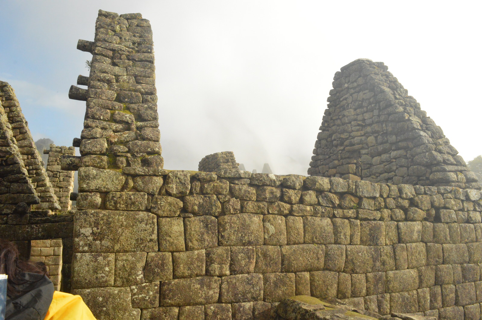 Que des marches. Des marches hautes. Ils n’étaient pas censés être petits les Incas?? Crime, des marches de géants! Il pleut et on est vite trempés. Le sac de vidanges est presque inutile. 1h30 à monter des marches à la grosse pluie, toute qu’une expérience! 1h30 vraiment PÉNIBLE!!! Mon prochain voyage, j’aurais pantalon de pluie et imperméable, c’est un must! Nous arrivons en haut et maintenant nous avons froid et nous n’avons de vêtements de rechange.