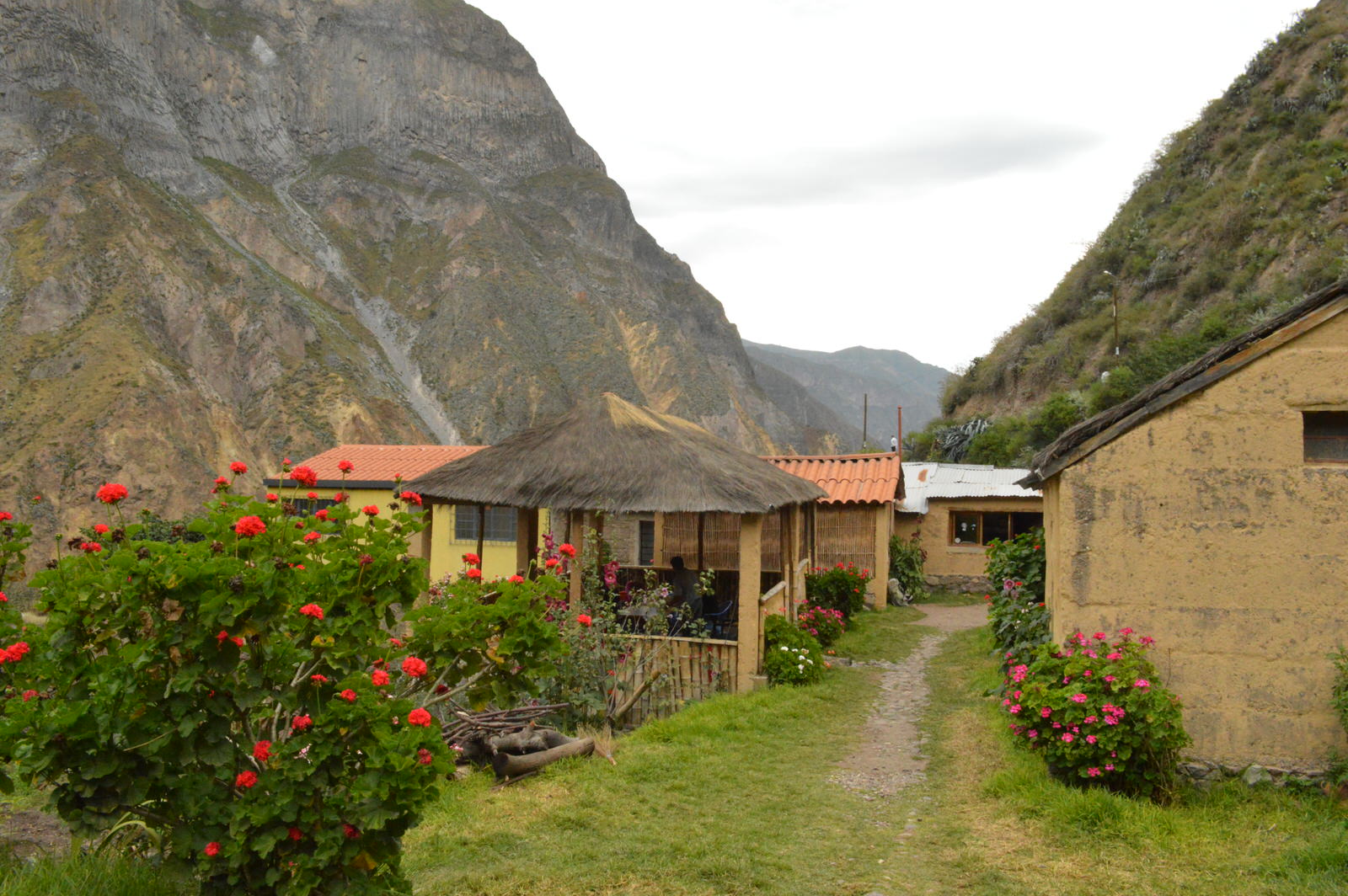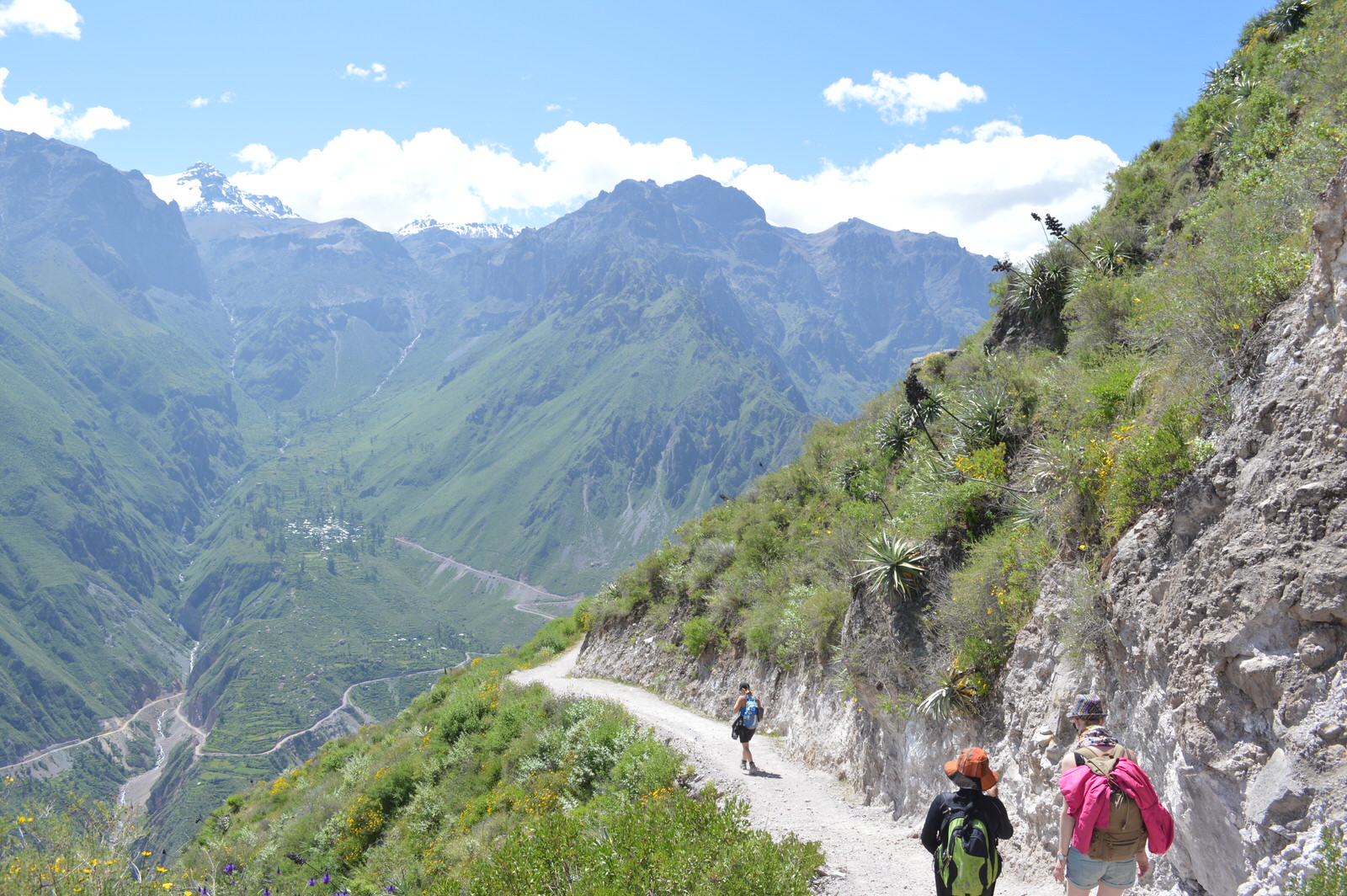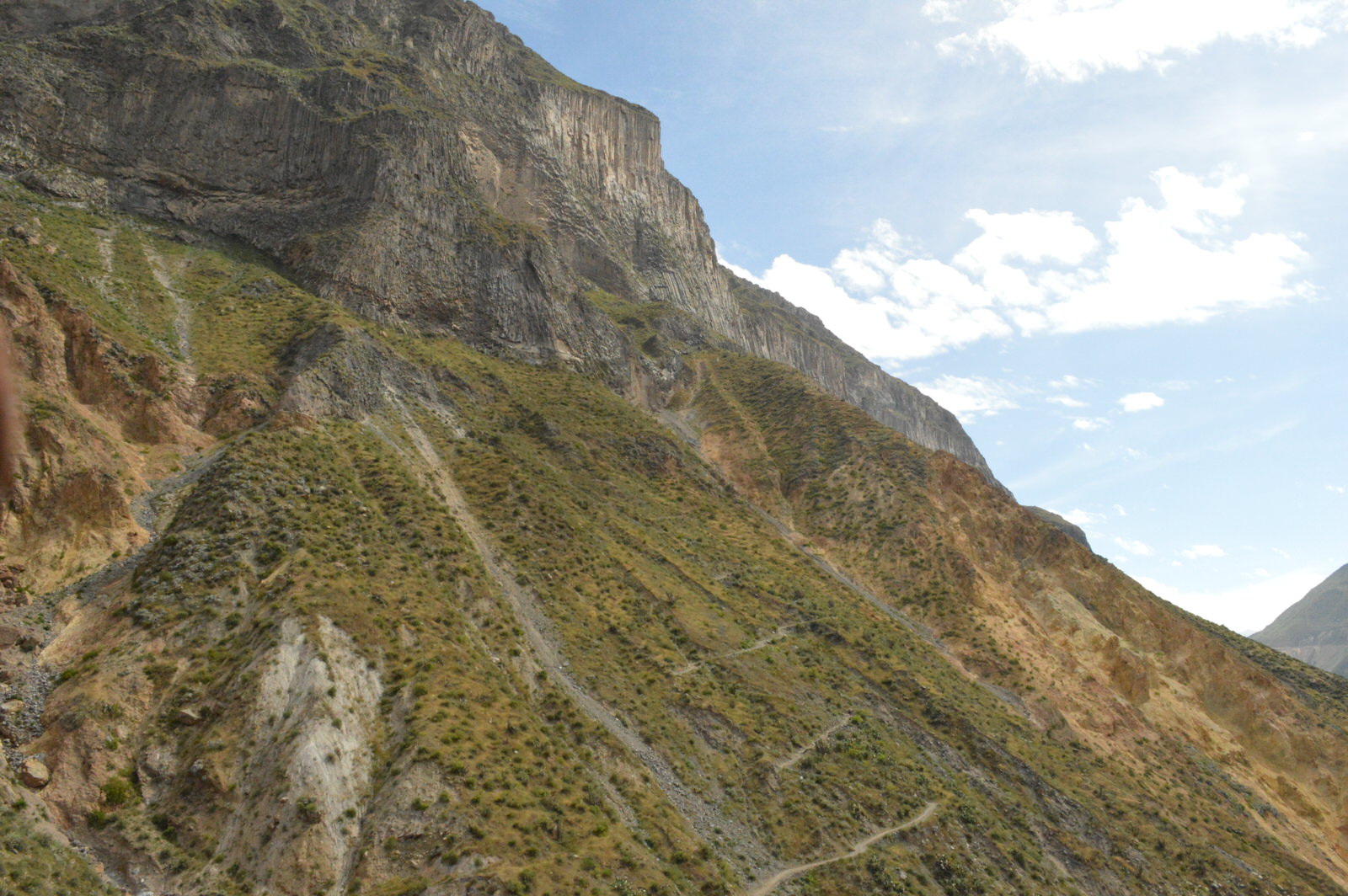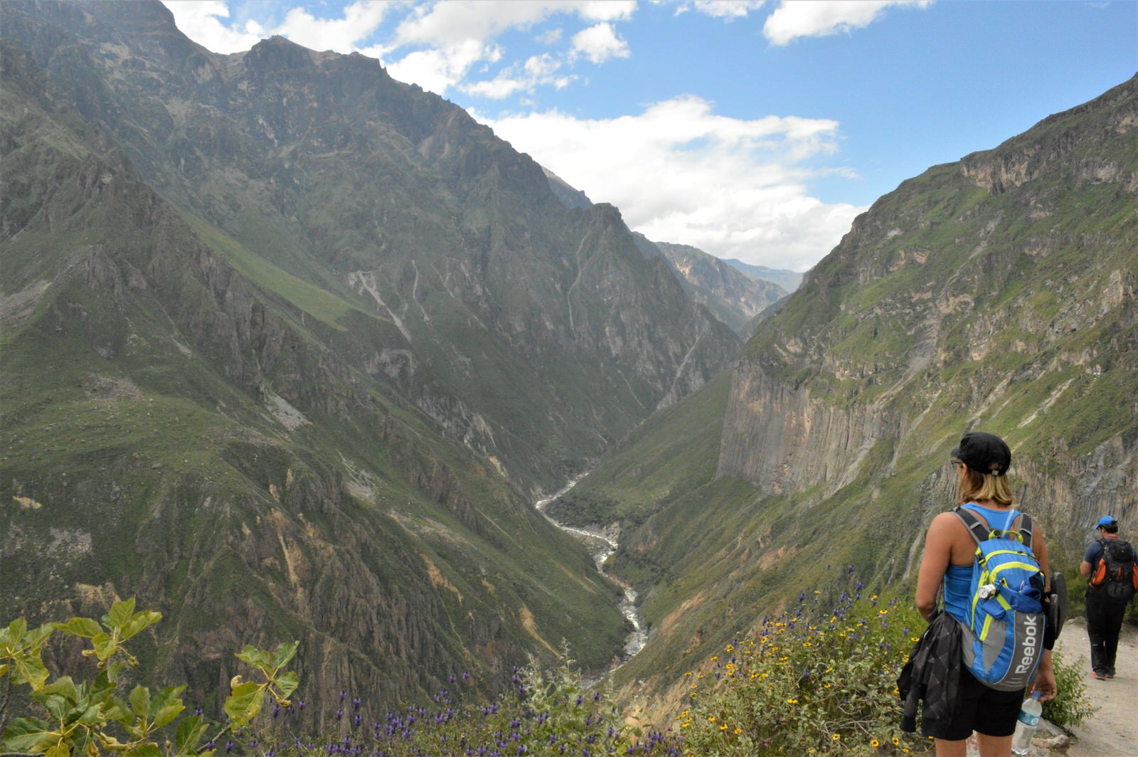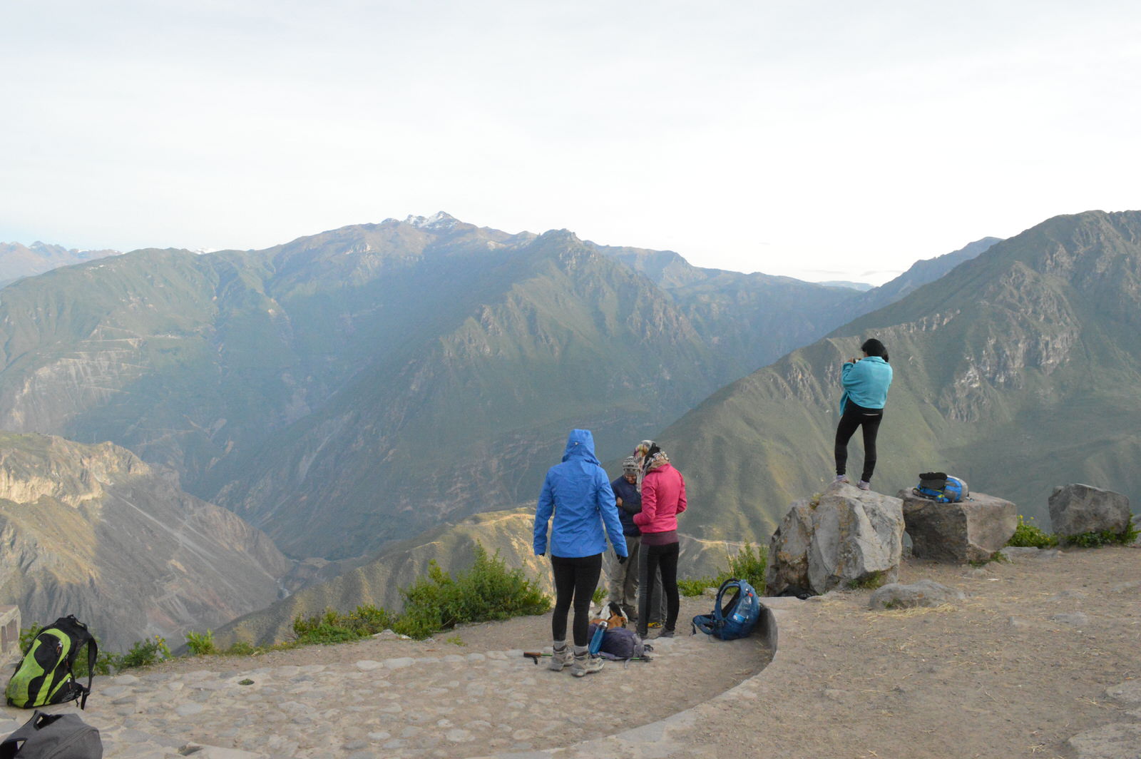 Dû au pépin mécanique, on rate les condors. Nous continuons la route et arrivons à Cabanaconde, point de départ de la descente dans le canyon. Ça commence drôlement bien, car le paysage est déjà spectaculaire et nous n’avons même pas débuté!