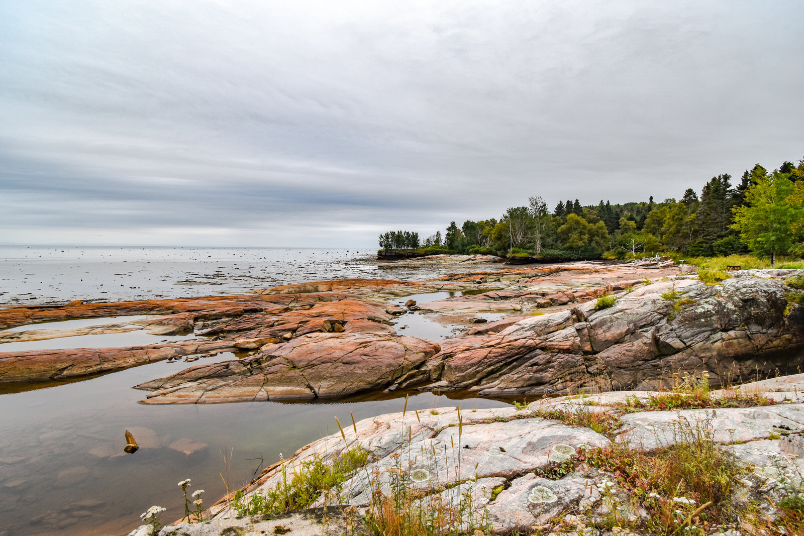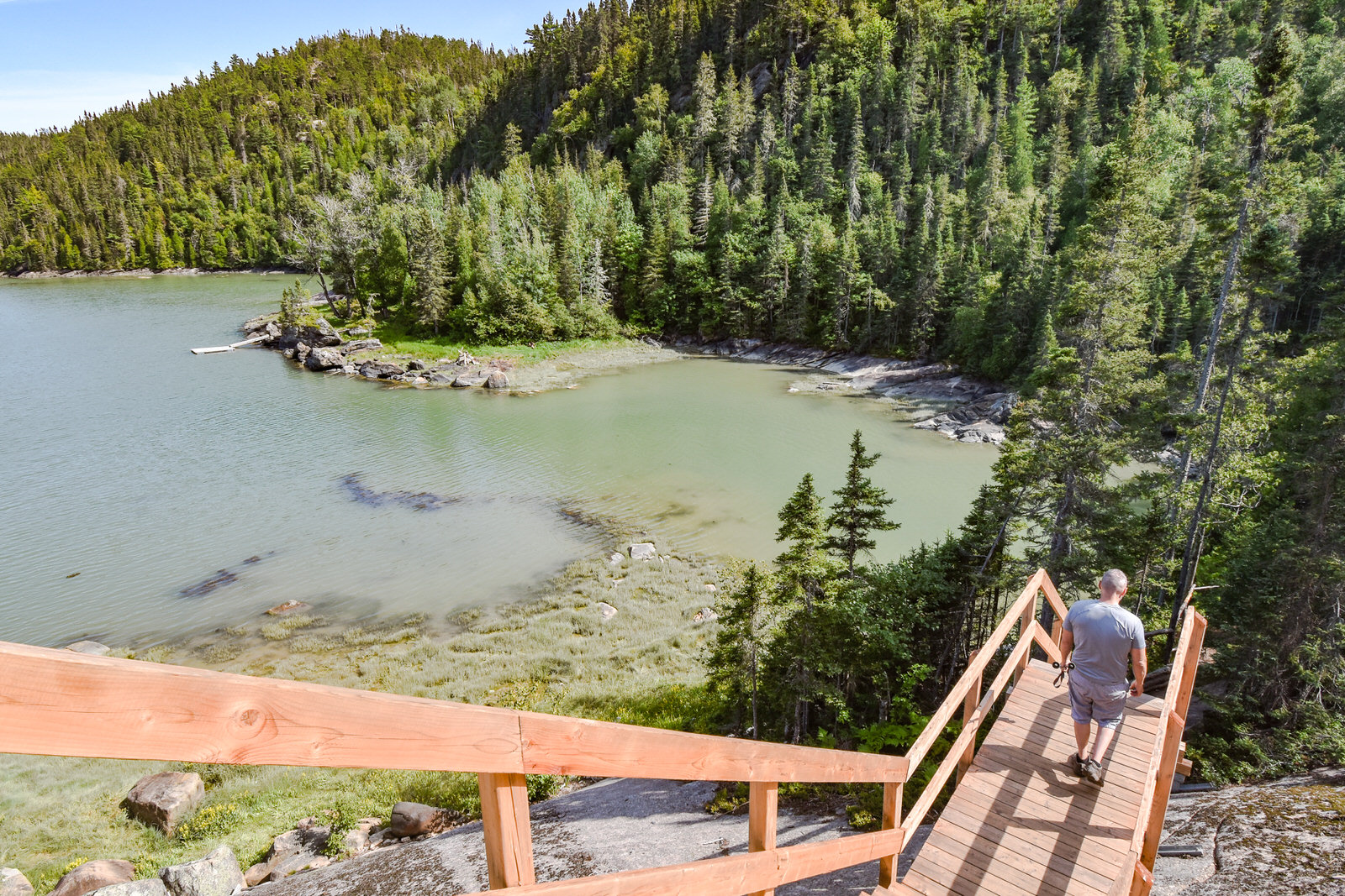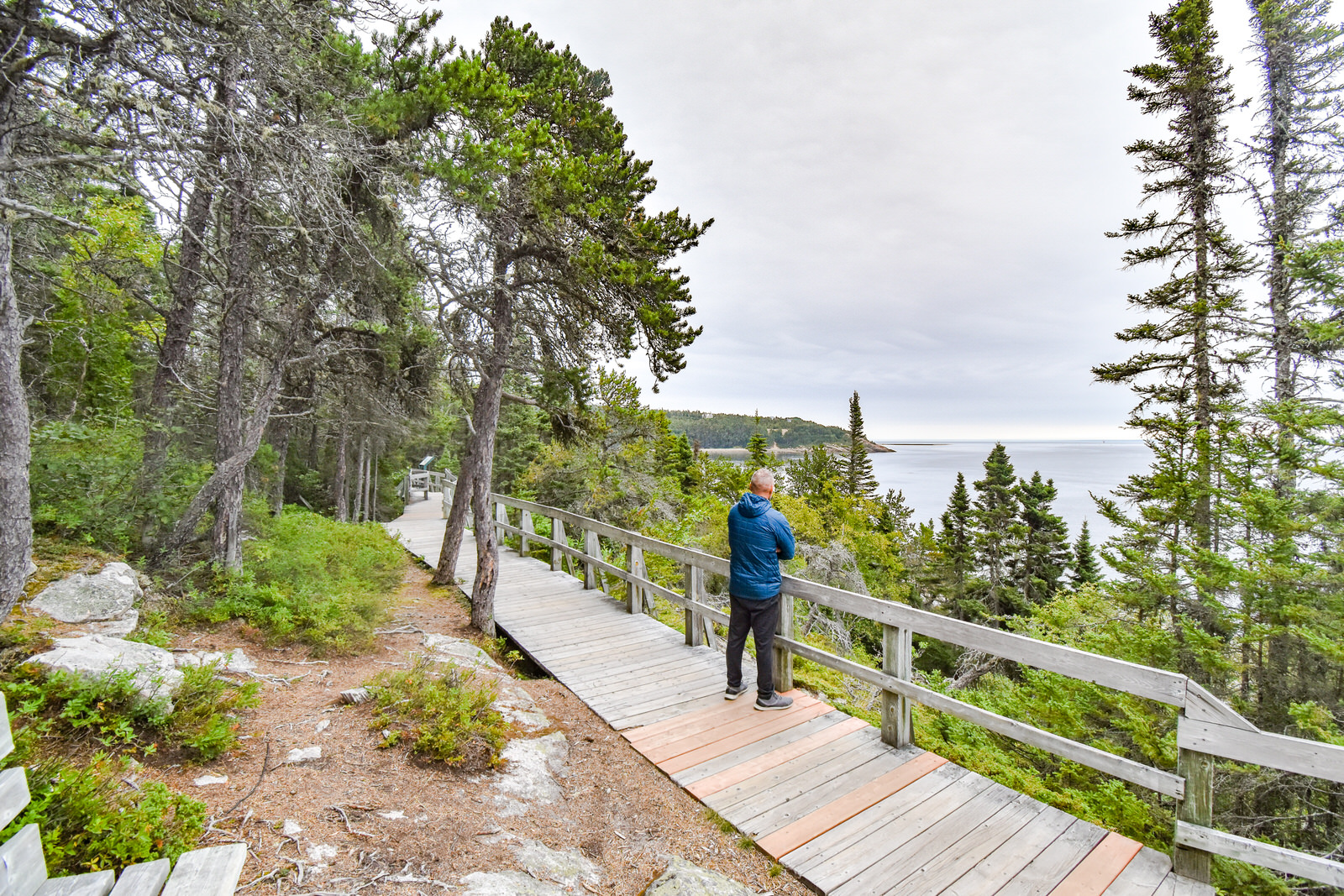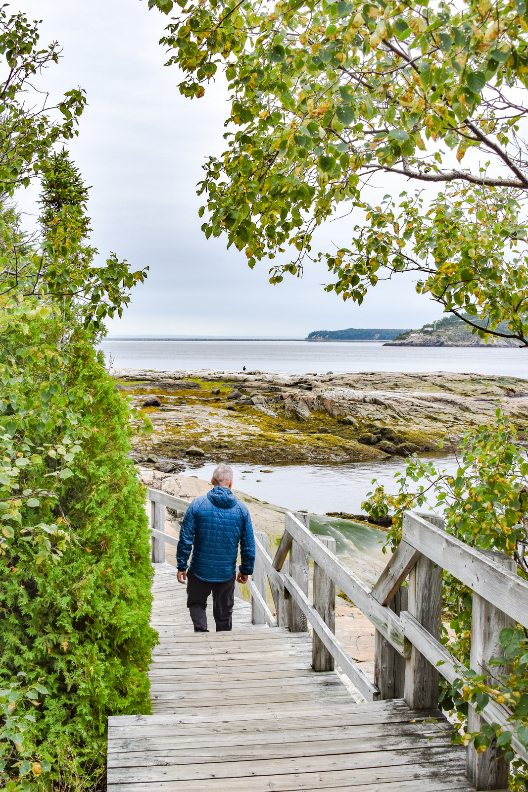 Puisque notre transport était à midi, nous sommes arrivés trop tard pour y faire le tour de l’île à pied à cause des marées. Nous avons quand même pu aller faire une belle balade pour y observer les monolithes à l’Anse des Érosions. Le sentier débute dans une magnifique forêt à parcourir sur un ponton de bois.