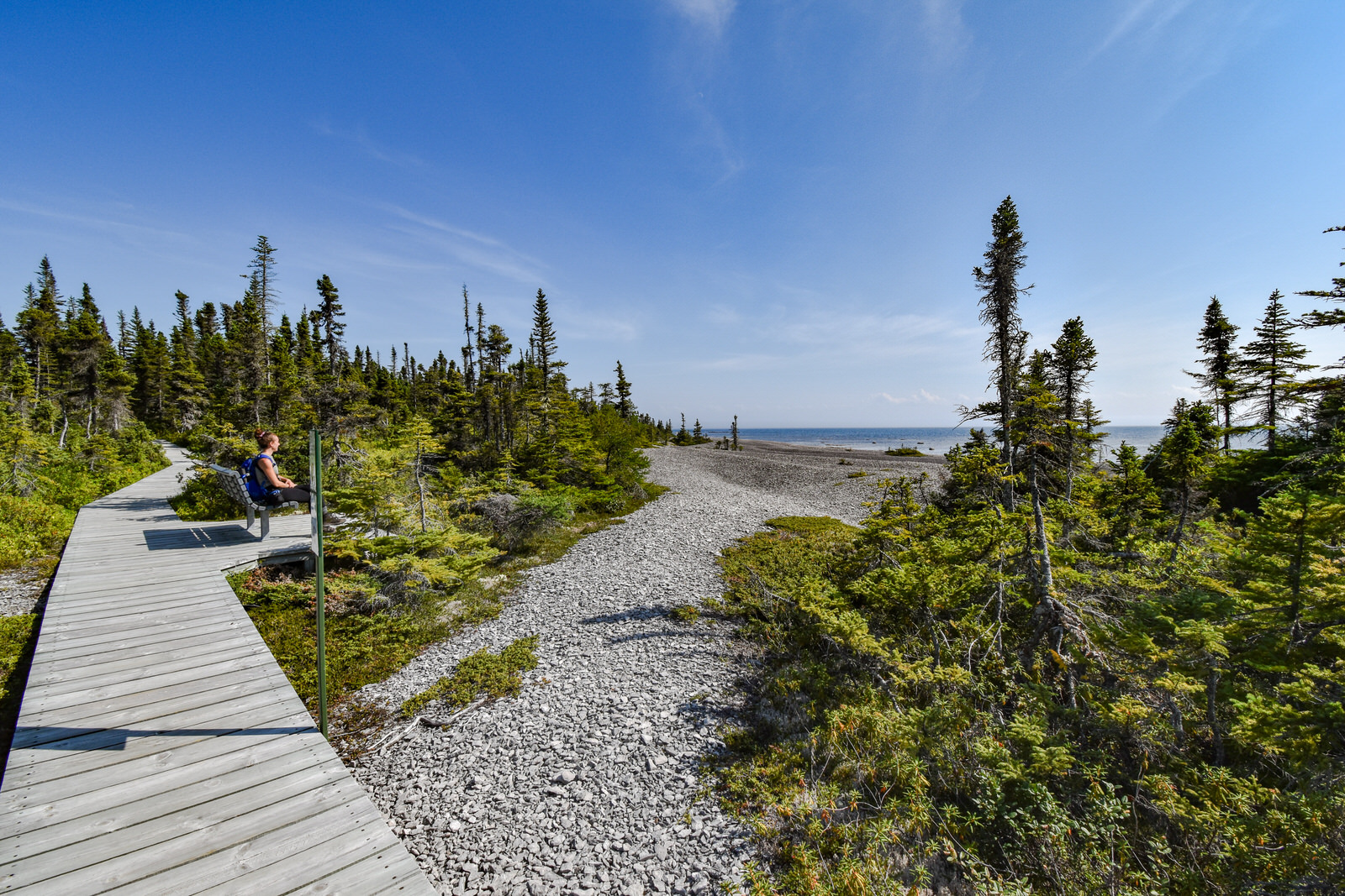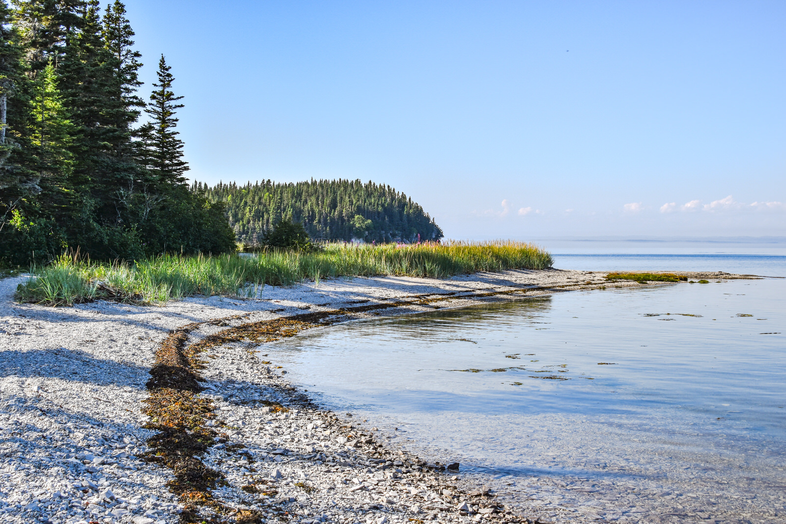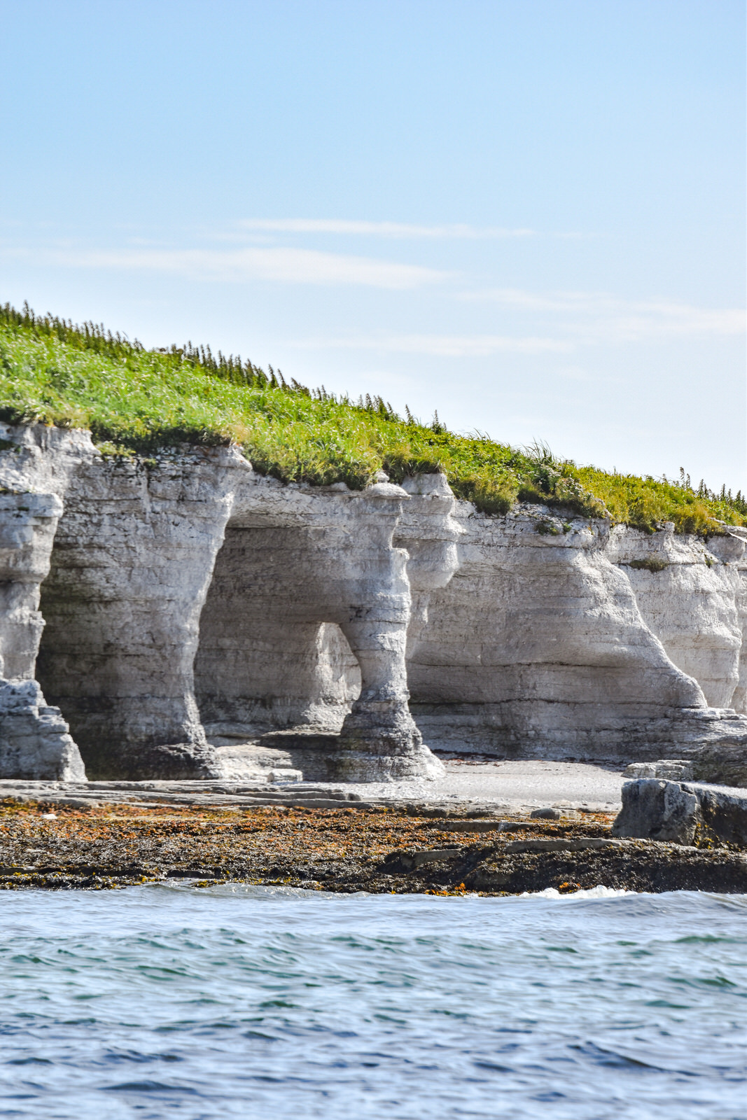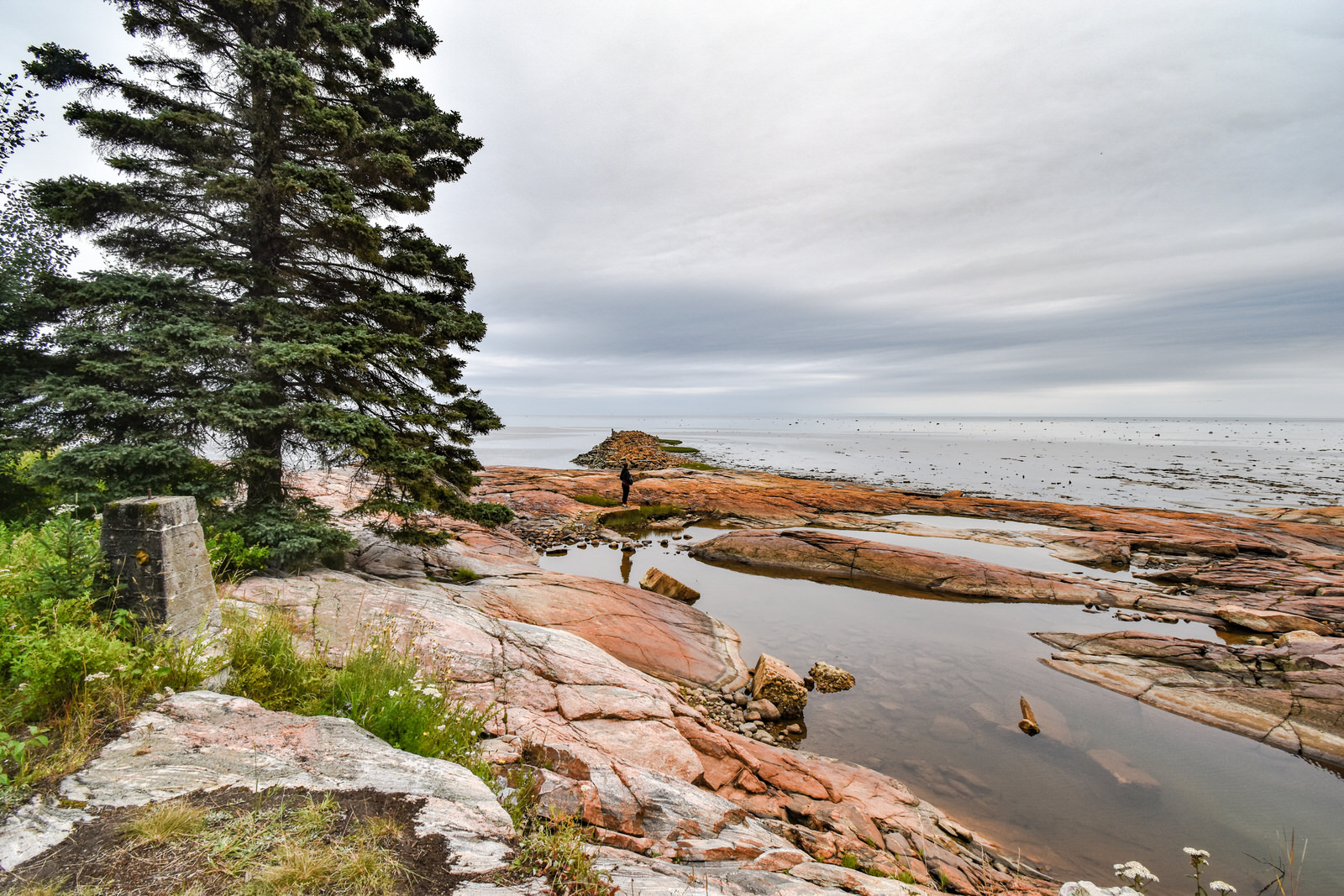 Puisque notre transport était à midi, nous sommes arrivés trop tard pour y faire le tour de l’île à pied à cause des marées. Nous avons quand même pu aller faire une belle balade pour y observer les monolithes à l’Anse des Érosions. Le sentier débute dans une magnifique forêt à parcourir sur un ponton de bois.