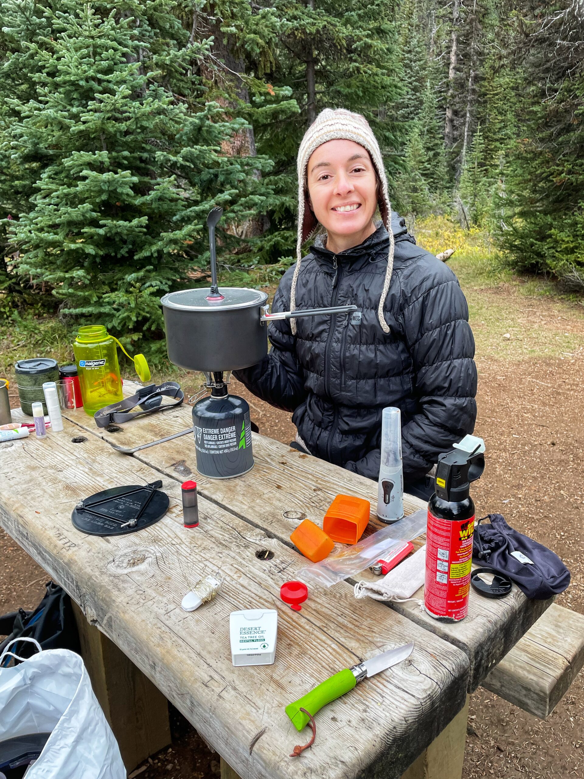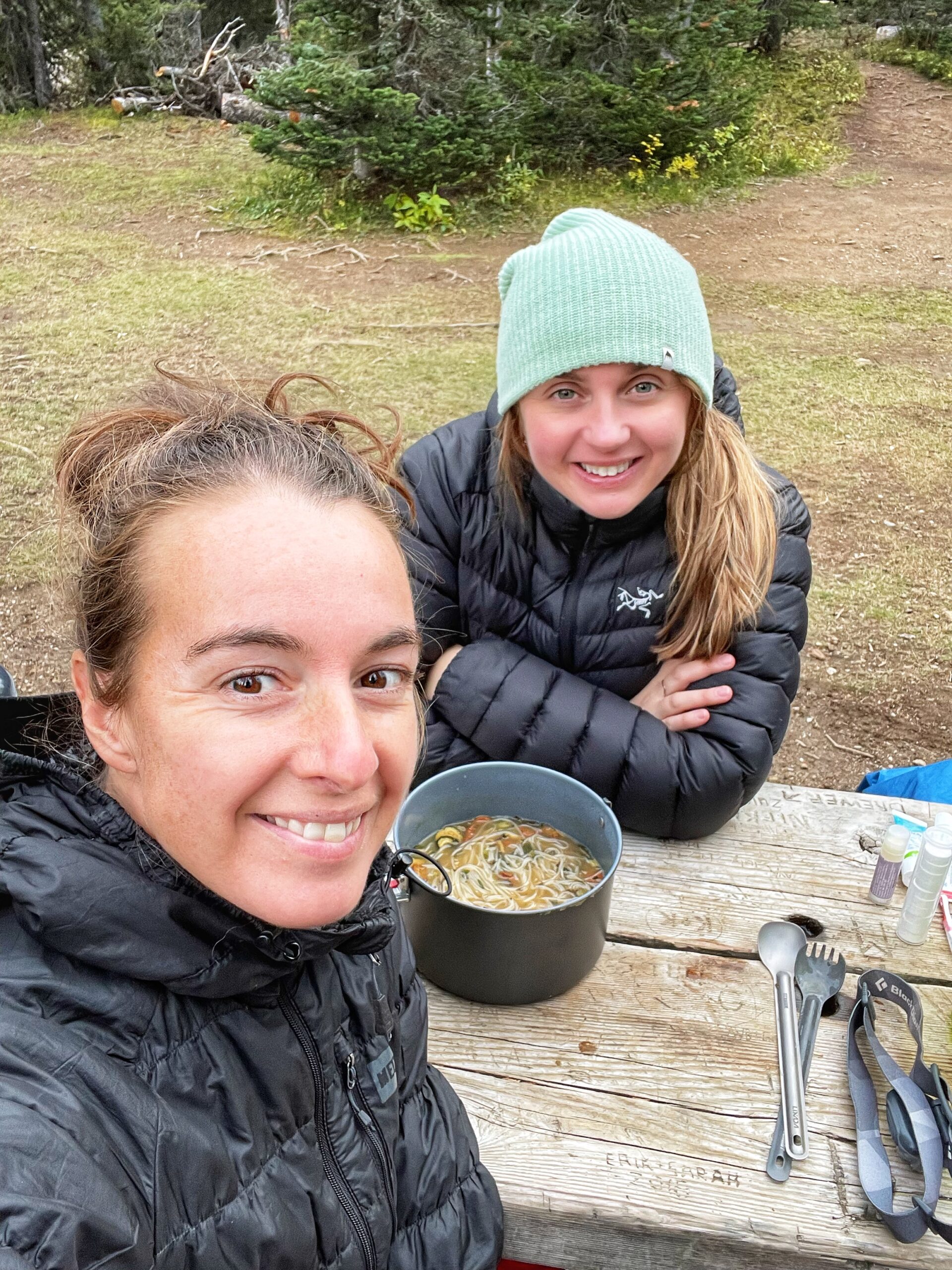 Nous avons installé notre tente à l’endroit prévu à cet effet. Une toilette sèche se trouve à proximité ainsi qu’une aire pour manger et suspendre notre nourriture. Nous avons mangé un bon repas chaud et avons dormi pratiquement 12h jusqu’au lendemain!