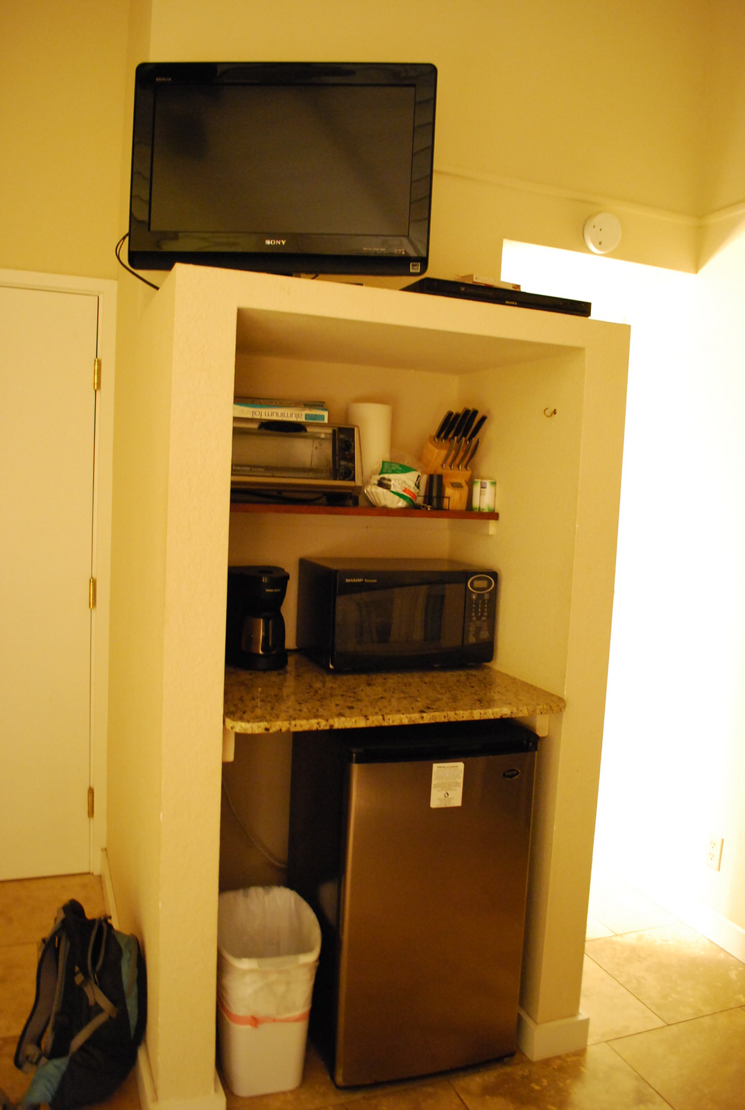 Dans le condo nous avions, four grille-pain, frigo, micro-onde et vaisselle incluse. À l’extérieur nous avions accès à un BBQ. Le Sandpiper Village est situé juste à côté de fabuleux terrains de golf. À 5 minutes en auto, il y a un magasin général, le Foodland