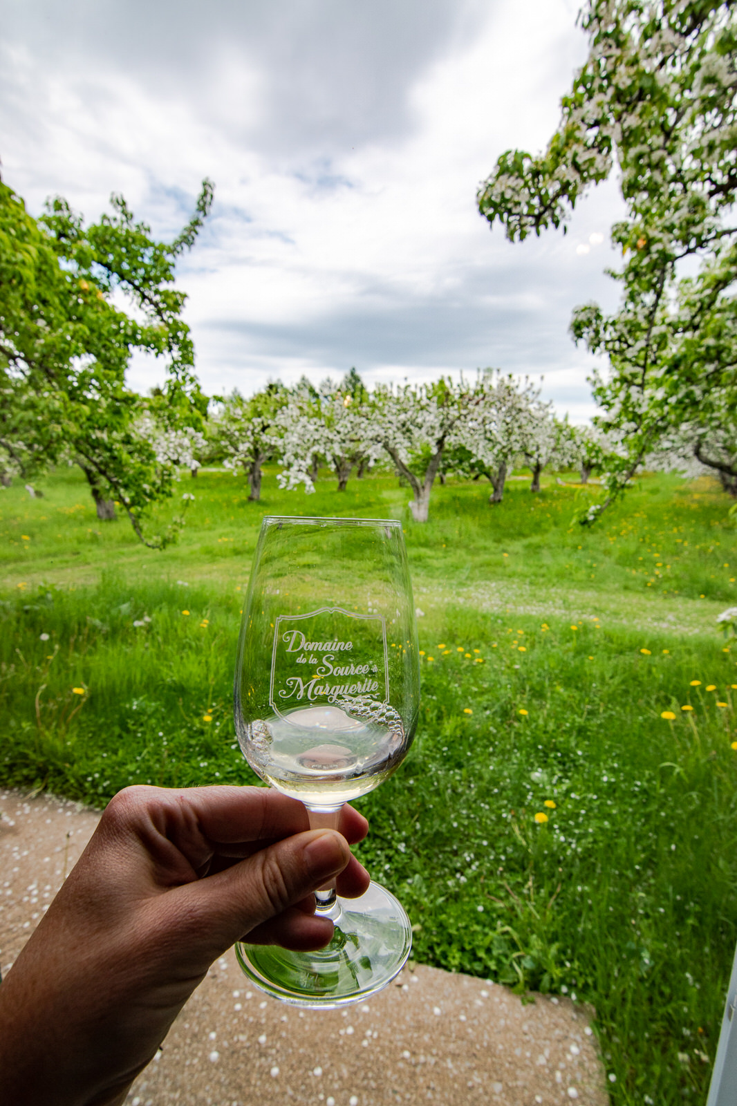 On se dirige vers le vignoble du Mitan en passant par la route du Mitan et on demande à Antoine d’y faire un petit arrêt pour prendre des photos dans les vergers!