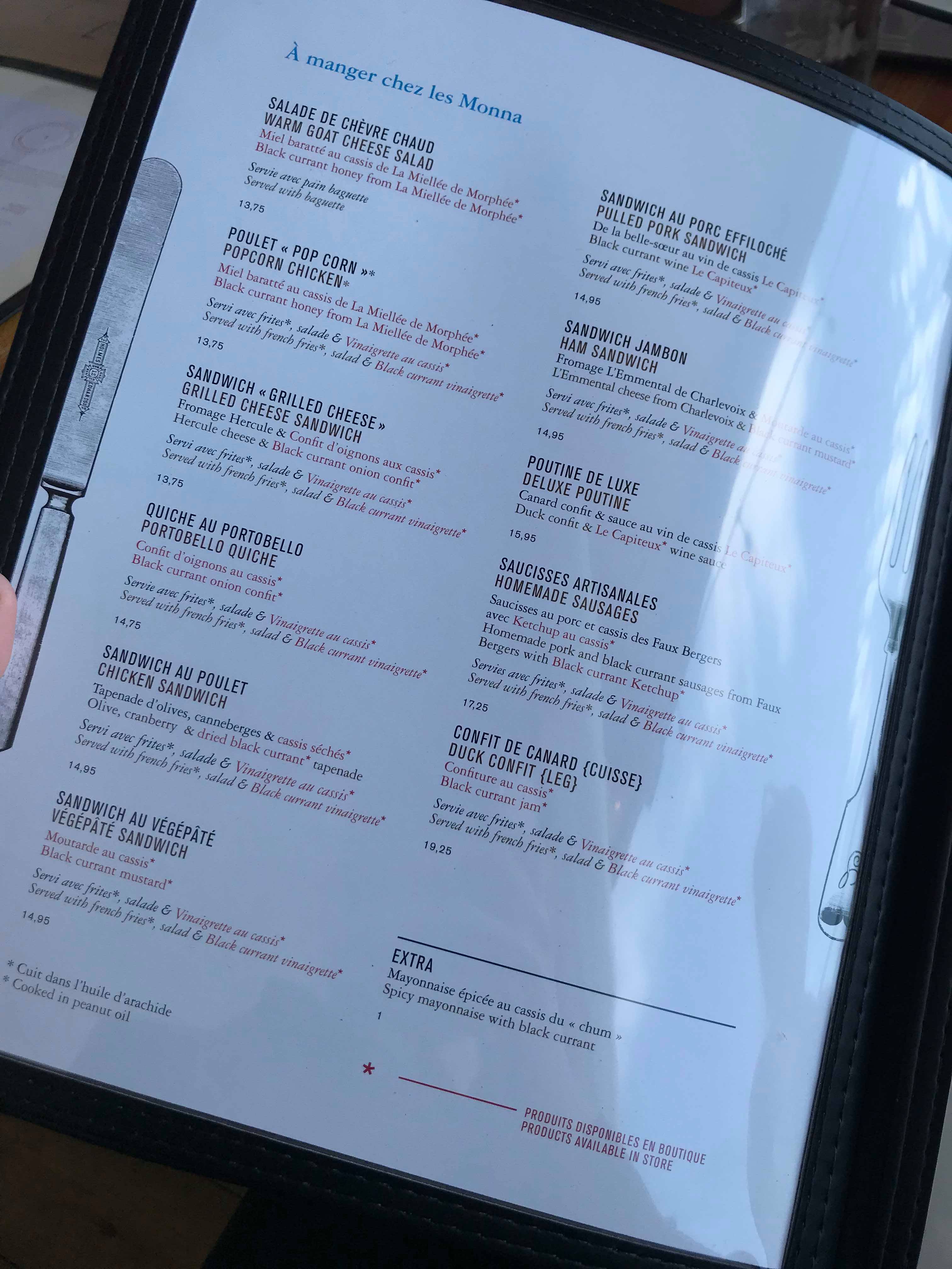 Impossible de ne pas vous parler de la nourriture servie ici! On y retrouve le cassis partout à notre plus grand bonheur! Même la sauce pour la poutine en a et c’est ce qui rend définitivement cette poutine dans mon top 3! C’est unique et délicieux! Je vous conseille d’ailleurs le poulet pop corn servit avec du miel baratté au Cassis de La Miellée de Morphée et le brillant Grilled Cheese avec oignons confits au cassis & fromage Hercule!