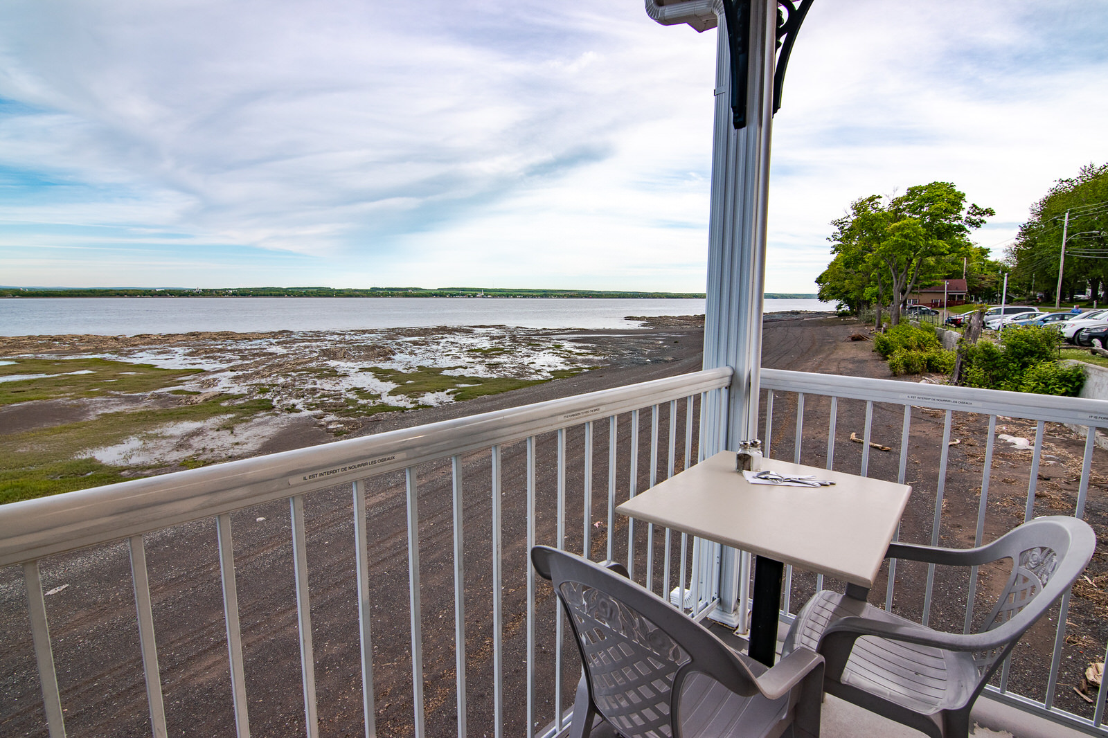 Samedi soir, on nous attendait au Resto de la Plage. On a été reçu chaleureusement par Sara qui nous amène sur la terrasse. On est tellement bien ici avec la vue depuis le balcon! Elle nous suggère un apéritif et moi je choisis le vin poiré bien sûr, un produit du terroir! Diane la propriétaire vient ensuite à notre rencontre. C’est comme une maman qu’on a envie de serrer dans ses bras!