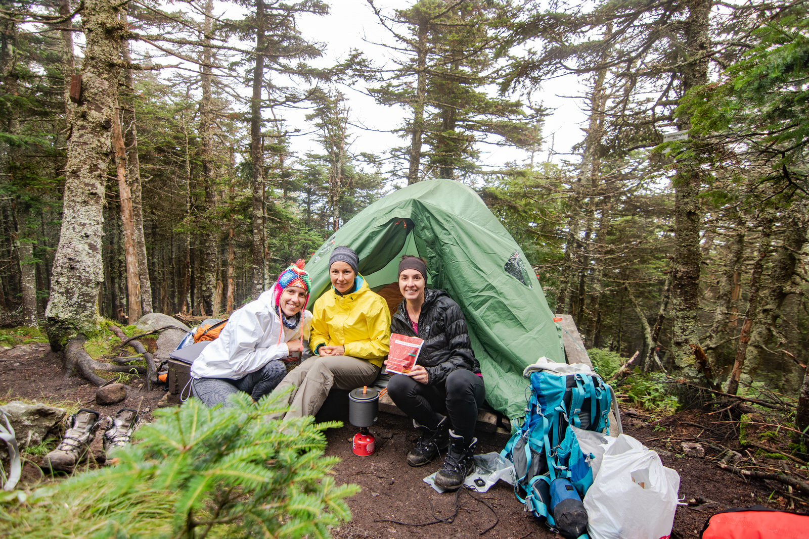 Il a plu encore toute la nuit jusqu’au matin. Je ne cacherais pas que nous sommes un peu maussades et légèrement tristes de ne pas avoir pu apercevoir la vue depuis la crête. La température ne semble pas vouloir changer. Combien de temps restons-nous dans cette humidité aujourd’hui? Restons-nous une nuit supplémentaire? Nous prenons la décision de ramasser notre camp et de retourner à Montréal aujourd’hui au lieu de demain. Nous avons testé notre capacité à faire du camping sous la pluie et ce fut une expérience enrichissante à nous débrouiller en montagne sous la pluie!