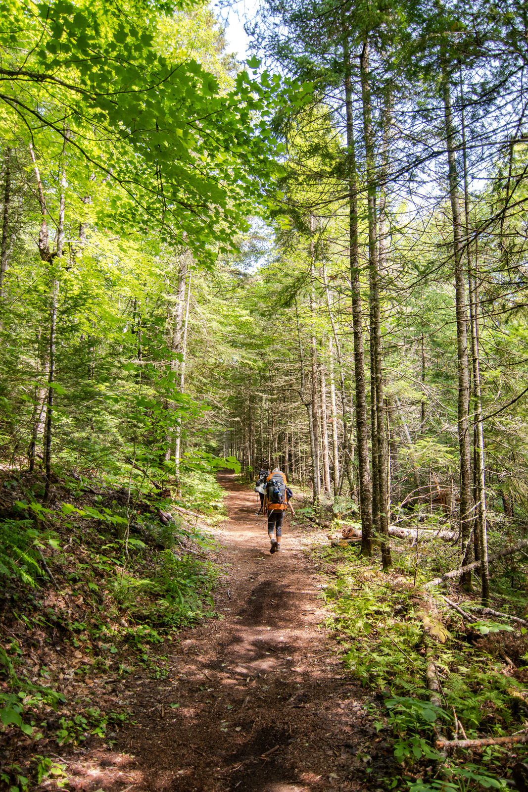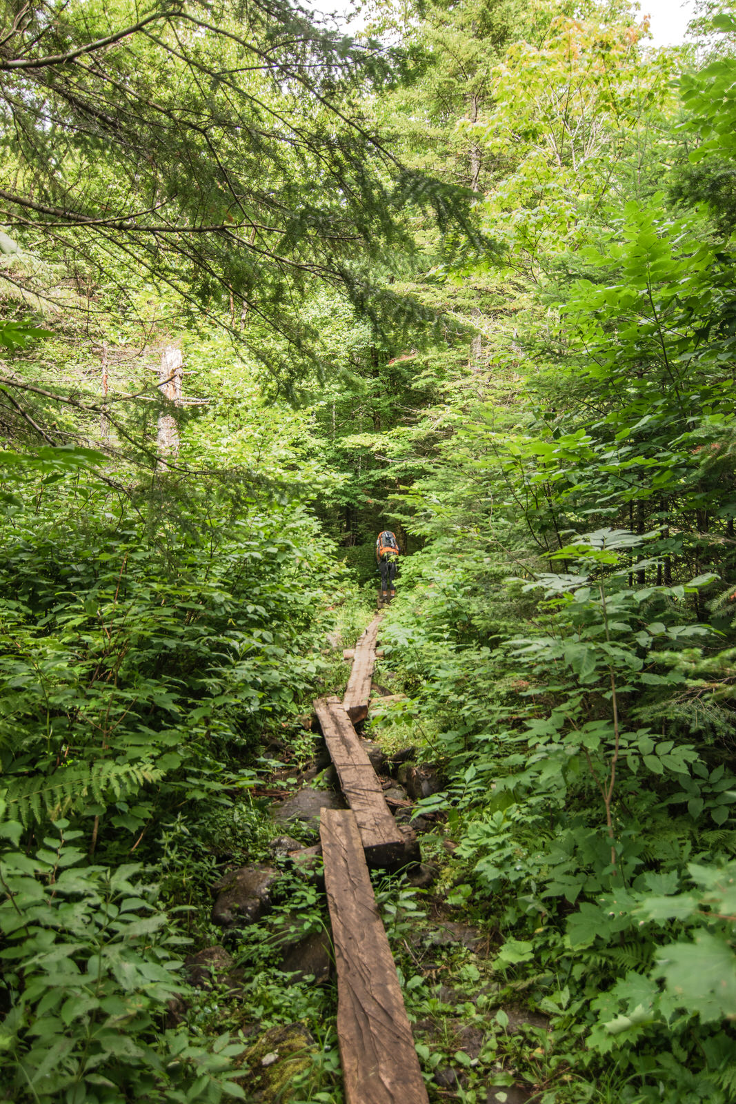 Nous arrivons au stationnement gratuit sur Stratton Brook road en début d’après-midi et nous partons à la conquête de cette montagne rêvée où nous y passerons deux nuits. Bien attelés, l’humidité, les mouches et le sac à dos rendront la marche fort plaisante…!