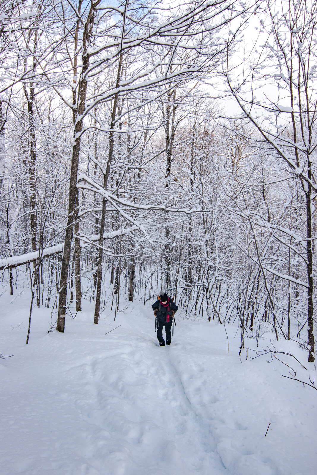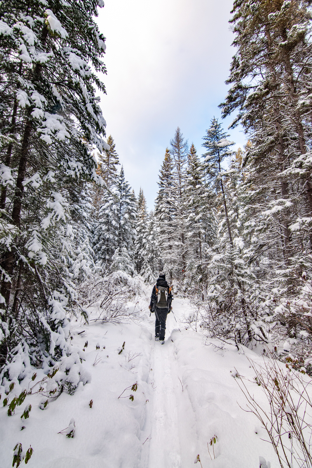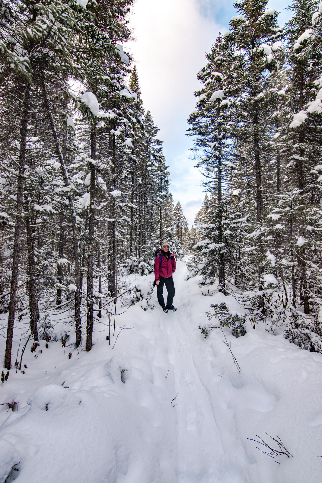 Notre journée oscille entre soleil et nuages, mais c’est parfait, pas une once de vent! Plus on arrive près du sommet, plus la neige est bien présente dans les arbres.