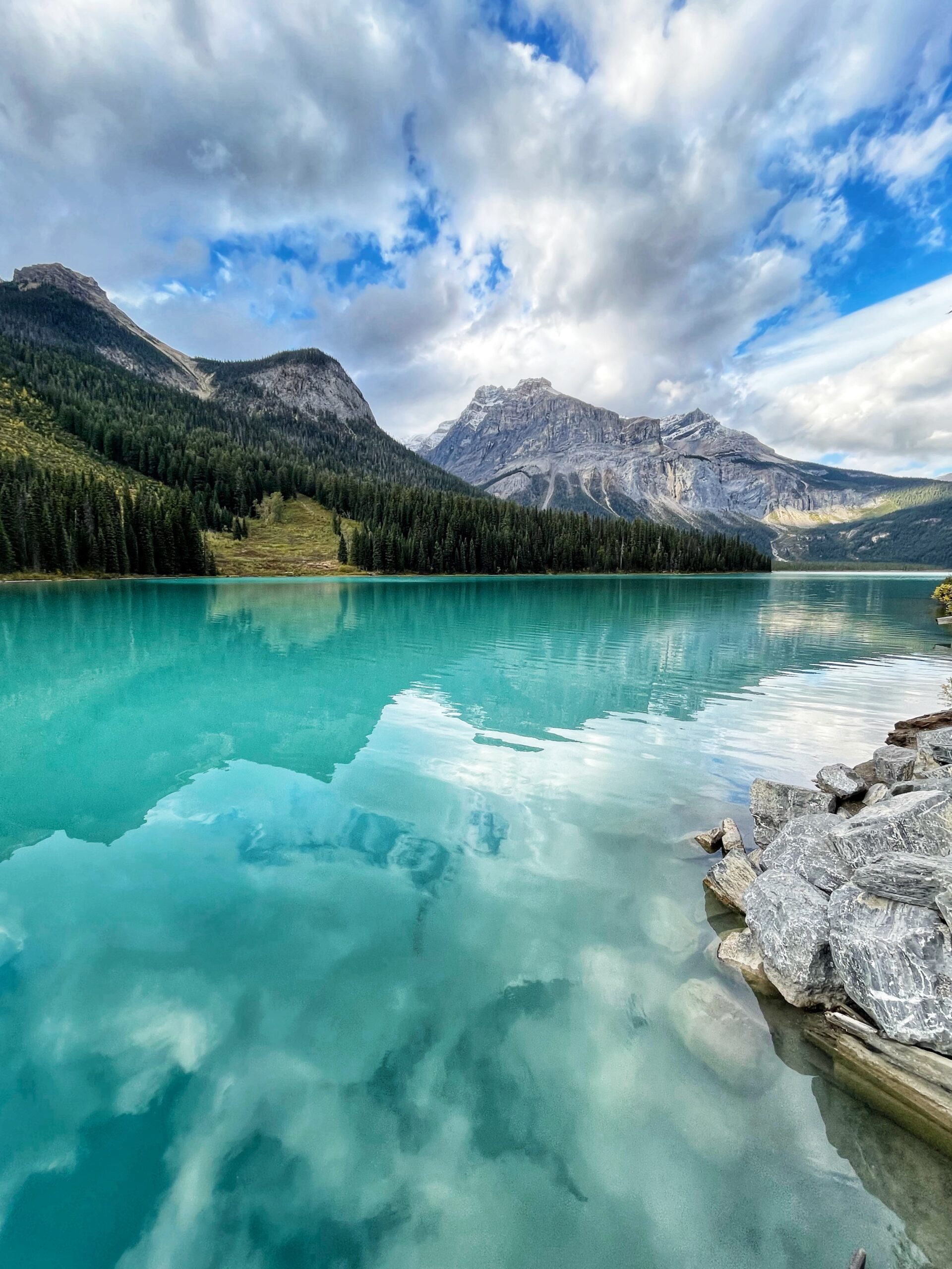 Départ dans le sens anti-horaire, nous nous dirigeons vers le lac Yoho en début d’après-midi. La température semble de notre côté, pas d’ours en vue et des arbres gigantesques semblent nous souhaiter la bienvenue. La beauté du mois de septembre pour faire des activités en nature, est l’absence de moustiques.