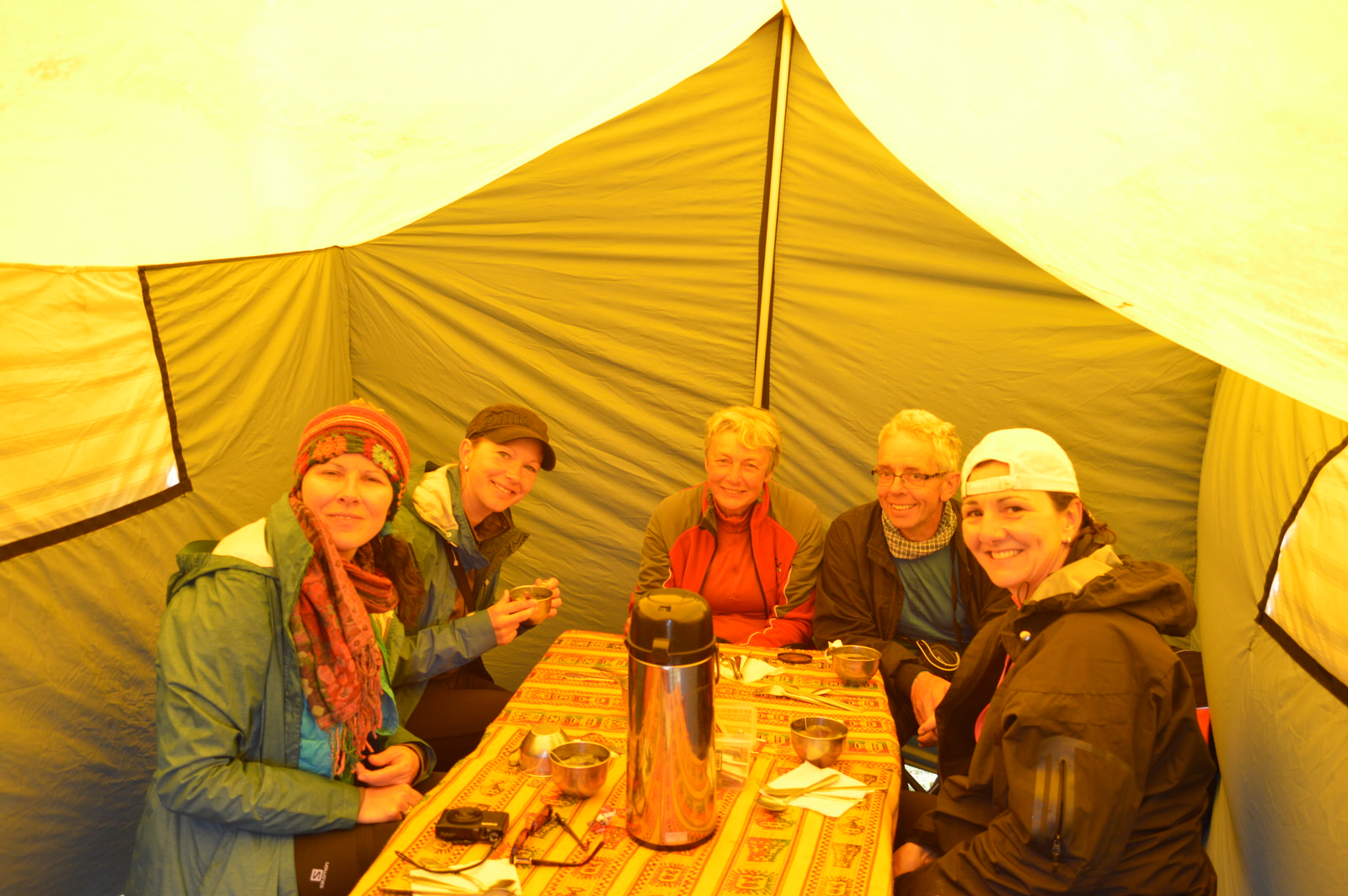 Tout se déroule bien jusqu’au 1er arrêt. Je ne me sens pas très bien, je suis étourdie et me sens faible. Je m’étends par terre et Margareth, infirmière de profession, me donne des pilules de coca. On croit que c’est le mal de l’altitude. Pourtant, je prends la médication pour ça, le diamox. Je réussis à marcher jusqu’au 1er campement pour le dîner. Je ne me sens vraiment pas bien. J’ai de la difficulté à respirer, mais je ne sais pas si c’est à cause de l’altitude ou parce que je panique un peu.