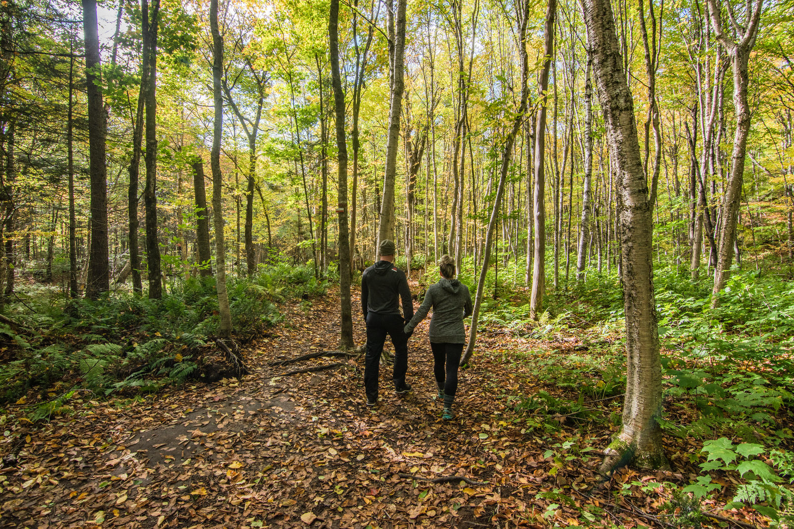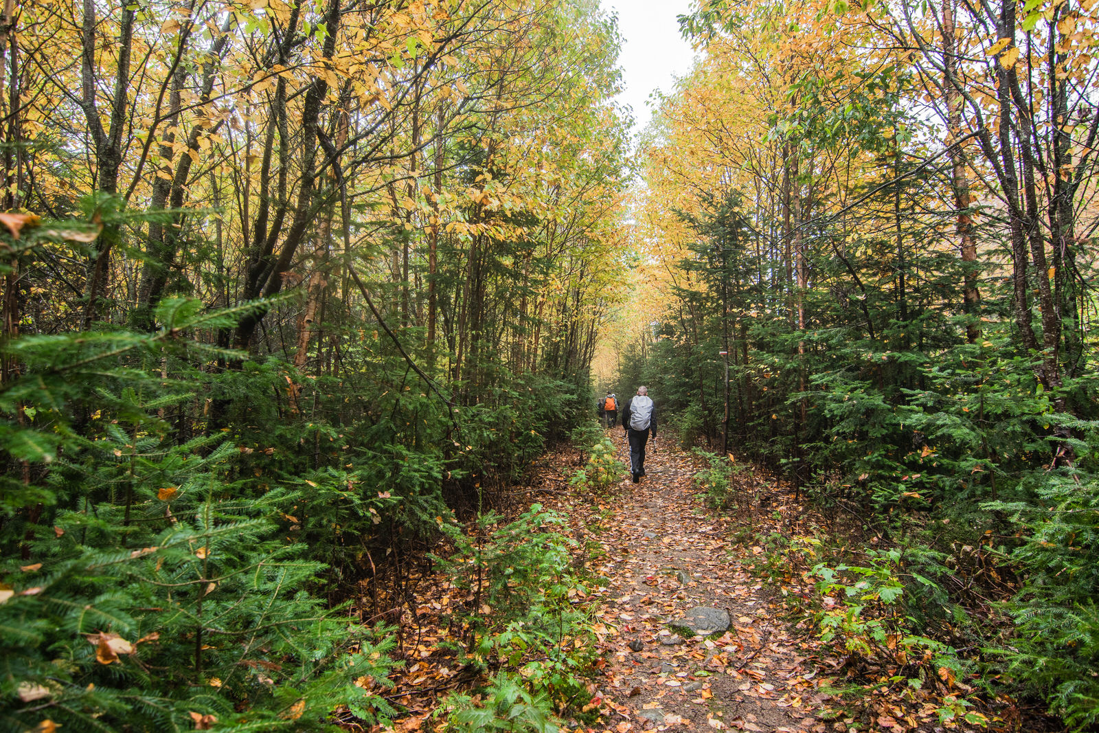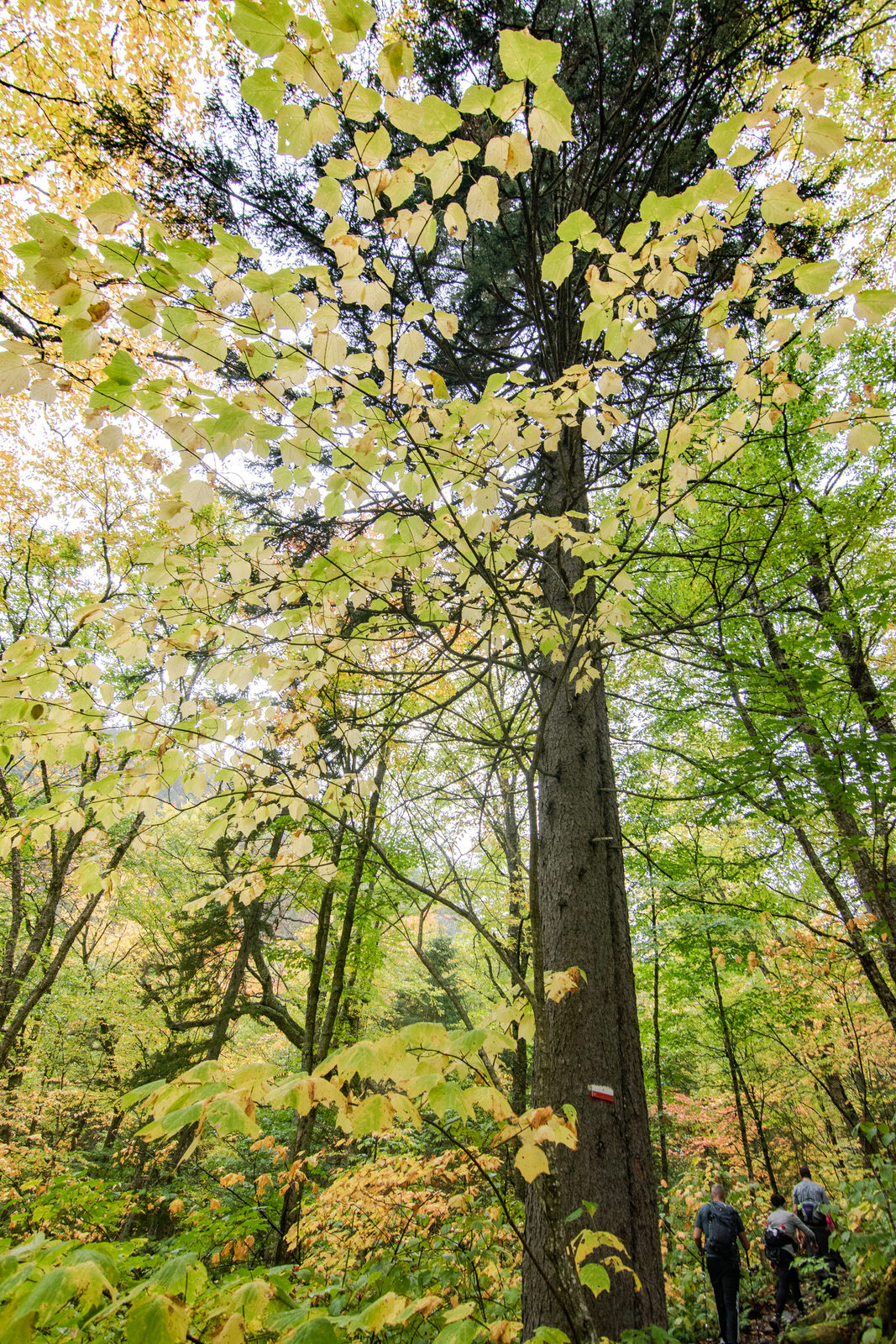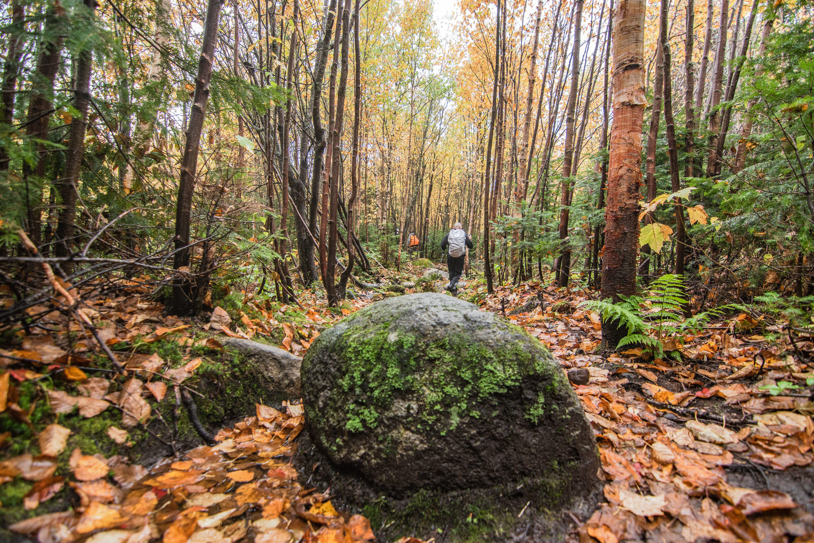 On débute sous un ciel gris en espérant qu’on mène une bonne vie, mais ça l’air que non! ahahah Les feuilles sont d’une couleur vive et je ne peux cesser d’avoir la tête levée vers la cime des arbres.