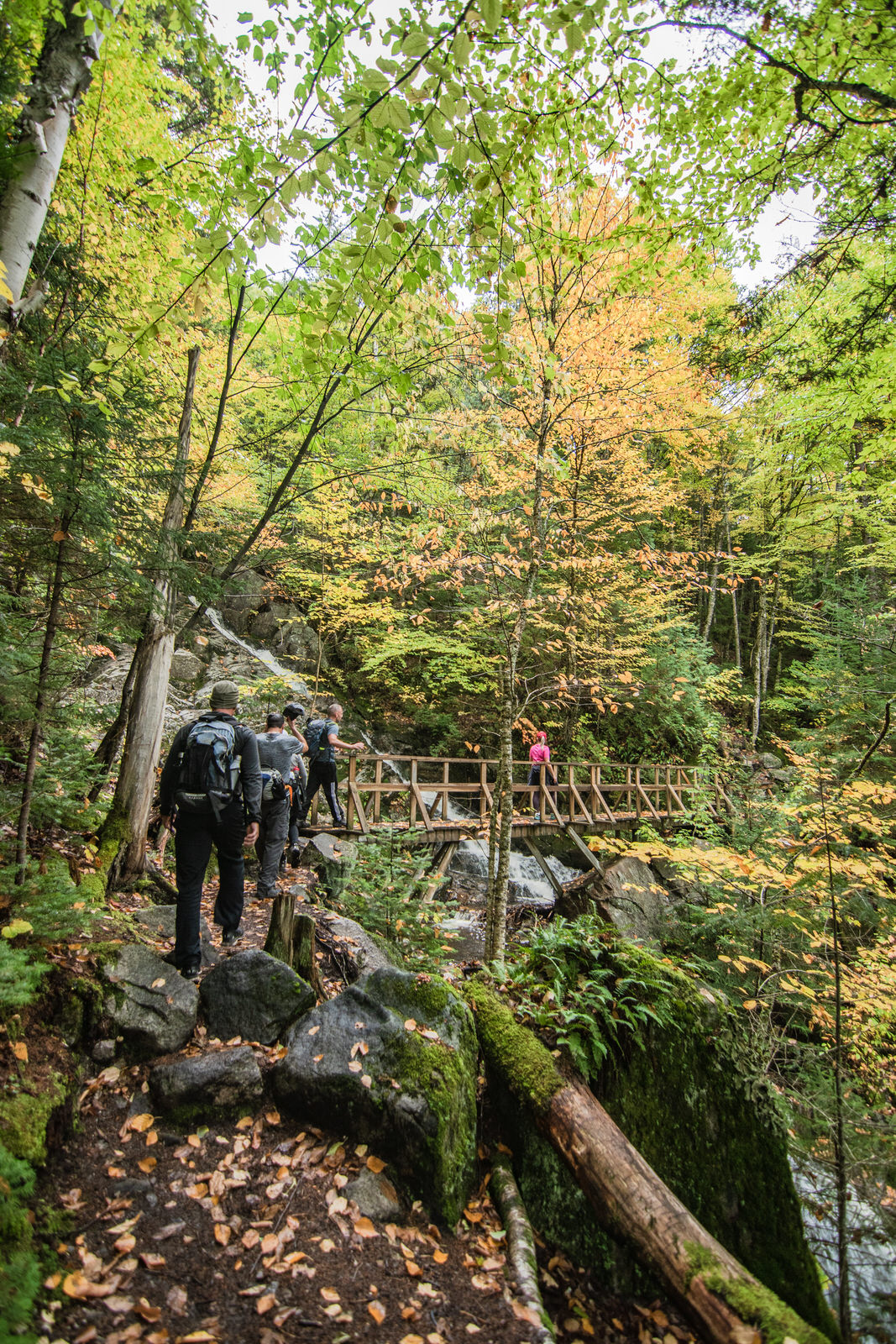 Emprunter cette partie du sentier très boueuse, nous avons eu droit à un éclairci hors de l’ordinaire : un trou dans les nuages laissant voir la chute Delaney! Quelle chance nous avons eue! Les nuages à flanc de montagne créaient une superbe ambiance malgré la pluie.